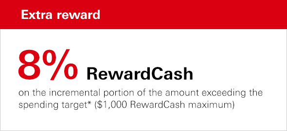 *If the spending target of a designated HSBC Business Mastercard is HK$5,000 and actual aggregate spending amount is HK$13,000, the extra RewardCash entitled is (HK$13,000 - HK$5,000) x 8% = $640 RewardCash.